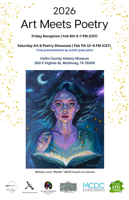 Art Meets Poetry is a collaboration between the Mockingbird Poetry Society and the Art Club of McKinney. The purpose of the event is to unite greater McKinney artists and poets by inspiring creativity and seeing in new ways. As Leonardo da Vinci once said, “Painting is poetry that is seen rather than felt, and poetry is painting that is felt rather than seen.”